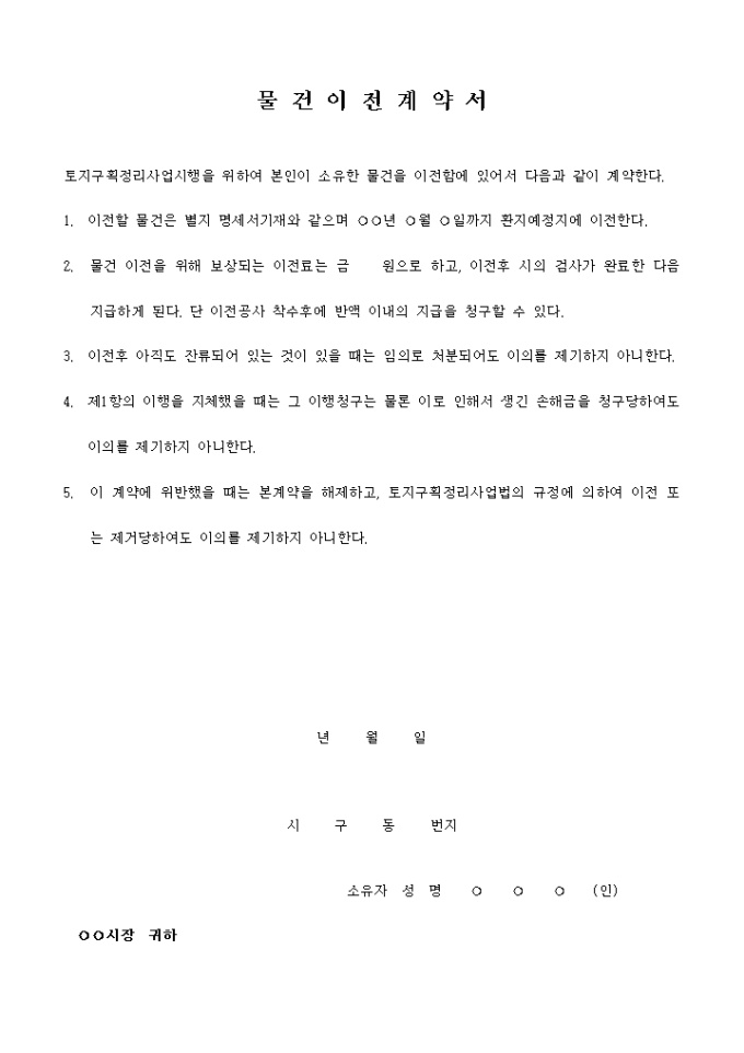 1. 이전할 물건은 별지 명세서기재와 같으며 년 월 일까지 환지예정지에 이전한다.