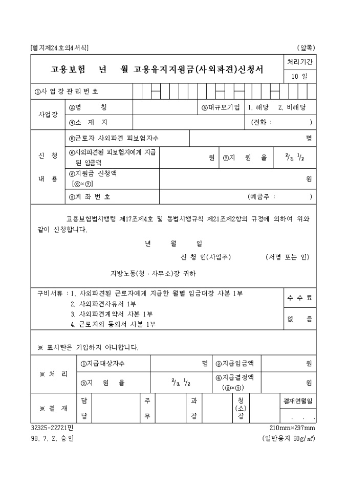 9,000원/월고용보험법시행령 제17조제4호 및 동법시행규칙 제21조제2항의 규정에 의하여 고용보험 년 월 고용유지 지원금(사외파견) 신청을 하고자 할 때 사용하는 "고용보험 년 월 고용유지 지원금(사외파견) 신청서" 양식입니다.