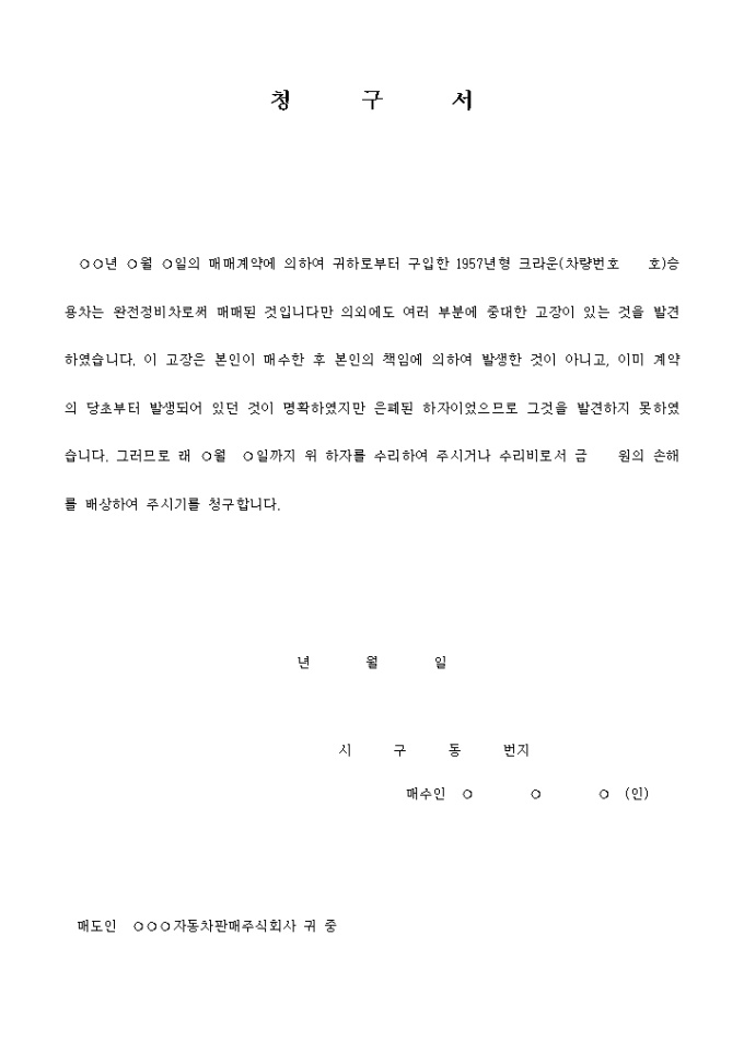 9,000원/월자동차하자수리청구서 입니다. 년 월 일의 매매계약에 의하여 귀하로부터 구입한 1957년형 크라운(차량번호 호)승용차는 완전정비차로써 매매된 것입니다만 의외에도 여러 부분에 중 대한 고장이 있는 것을 발견하였습니다. 이 고장은 본인이 매수한 후 본인의 책임에 의하여 발생한 것이 아니고 ...