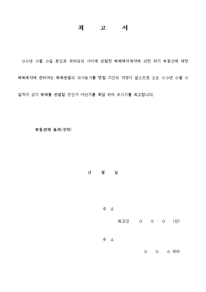 9,000원/월토지예약완결최고서 입니다. 년 월 일 본인과 귀하와의 사 이에 성립한 매매예약계약에 의한 하기 부동산에 대한 매매예약에 관하여 는 매매완결의 의사표시를 행할 기간의 약정이 없으므로 오는 년 월 일까지 상기 매매를 완결할 것인가 아닌가를 확답 하여 주시기를 최고합니다. ...