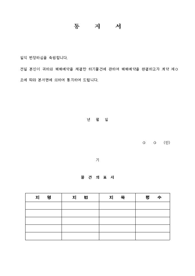 9,000원/월토지예약완결통지서 입니다. 일익 번창하심을 축원합니다. 전일 본인이 귀하와 매매예약을 체결한 하기물건에 관하여 매매예약을 완결하고자 계약 제 조에 따라 본서면에 의하여 통지하여 드립니다. ...
