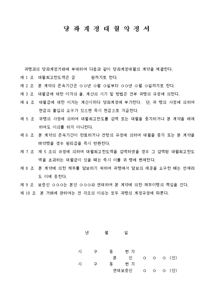 9,000원/월당좌계정대월약정서 예제 입니다. 제 1 조 대월최고한도액은 금 원까지로 한다. 제 2 조 본 계약의 존속기간은 년 월 일부터 년 월 일까지로 한다. 제 3 조 대월금에 대한 이자의 율, 계산의 시기 및 방법은 전부 귀행의 규정에 의한다. 제 4 조 대월금에 대한 이자는 계산시마다 당좌계정에 부가한다. 단, 귀 행의 사정에 의하여 현금의 불입의 요구가 있으면 즉시 현금으로 지급한다. ...