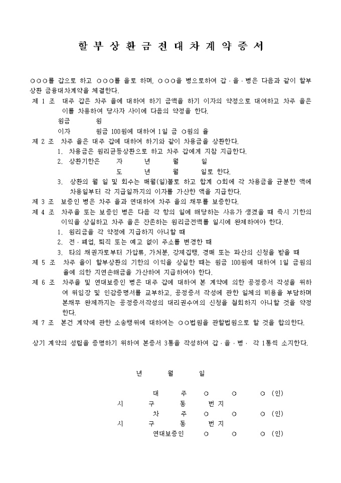 할부상환금전대차계약증서 예제 입니다. ○○○를 갑으로 하고 ○○○를 을로 하며, ○○○을 병으로 하여 갑 을 병은 다음과 같이 할부상환 금융대차계약을 체결한다. 제 1 조 대주 갑은 차주 을에 대하여 하기 금액을 하기 이자의 약정으로 대여하고 차주 을은 이를 차용하여 당사자 사 이에 다음의 약정을 한다. ...
