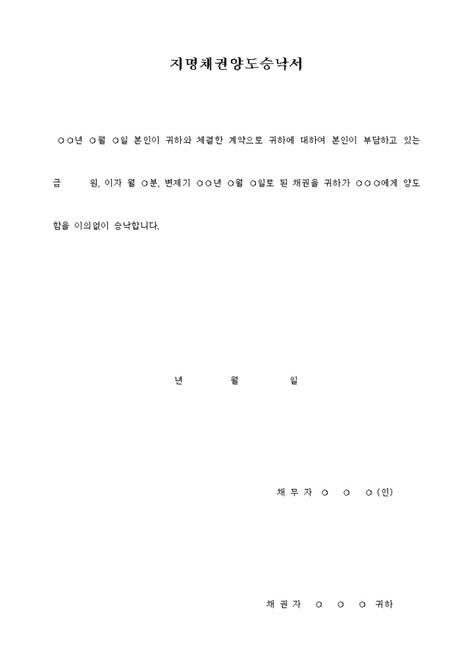 지명채권양도승락서 입니다. ○○년 ○월 ○일 본인이 귀하와 체결한 계약으로 귀하에 대하여 본인이 부담하고 있는 금 원, 이자 월 ○분, 변제기 ○○년 ○월 ○일로 된 채권을 귀하가 ○○○에게 양도함을 이의없이 승낙합니다. ...