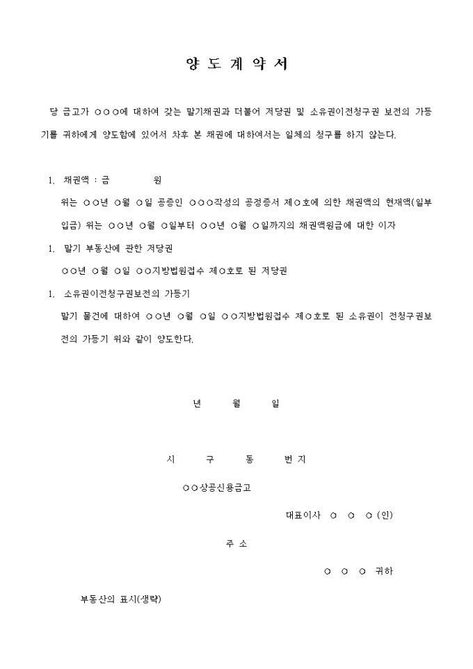 당 금고가 에 대하여 갖는 말기채권과 더불어 저당권 및 소유권이전청구권 보전의 가등기를 귀하에게 양도함에 있어서 차후 본 채권에 대하여서는 일체의 청구를 하지 않는다.