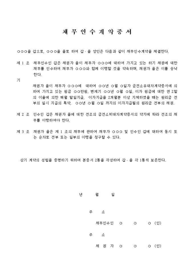 대금채무중첩적인수계약 예제 입니다. ○○○을 갑으로 , ○○○을 을로 하여 갑 을 양인은 다음과 같이 채무인수계약을 체결한다. 제 1 조 채무인수인 갑은 채권자 을이 채무자 ○○○에 대하여 가지고 있는 하기 채권에 대한 채무를 인수하여 채무자 ○○○와 함께 이행할 것을 약속하며, 채권자 을은 이를 승낙한다. ...