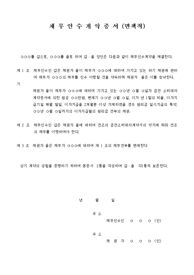 9,000원/월채무인수계약증서(면책적) 예제 입니다. ○○○를 갑으로 , ○○○를 을로 하여 갑 을 양인은 다음과 같이 채무인수계약을 체결한다. 제 1 조 채무인수인 갑은 채권자 을이 채무자 ○○○에 대하여 가지고 있는 하기 채권에 관하여 채무자 ○○○의 채무를 인수 이행할 것을 약속하며 채권자 을은 이를 승낙한다. ...