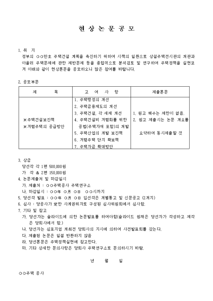 9,000원/월현상논문공모 입니다. 1. 취 지 정부의 만호 주택건설 계획을 촉진하기 위하여 시책의 일환으로 상설주택전시관의 개관과 아울러 주택문제에 관한 제반문제 등을 종합적으로 분석검토 및 연구하여 주택정책을 실현코저 아래와 같이 현상론문을 공모하오니 많은 참여를 바랍니다. ...