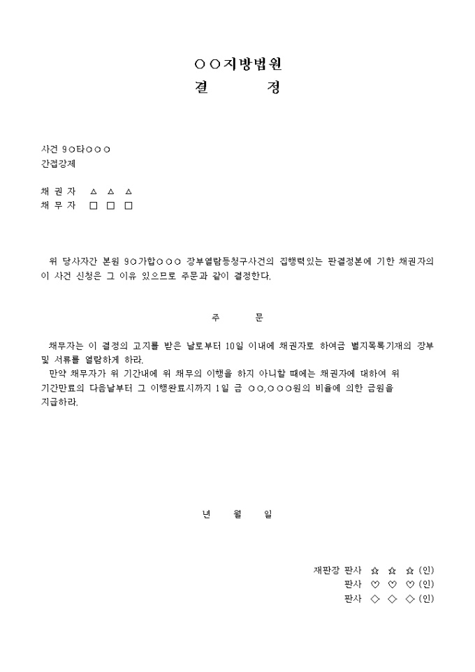 9,000원/월장부열람등청구사건의 집행력있는 판결정본에 기한 채권자의 이 사건 신청은 그 이유 있으므로 채무자는 이 결정의 고지를 받은 날로부터 10일 이내에 채권자로 하여 금 별지목록기재의 장부 및 서류를 열람하게 하라는 내용의 결정서입니다.