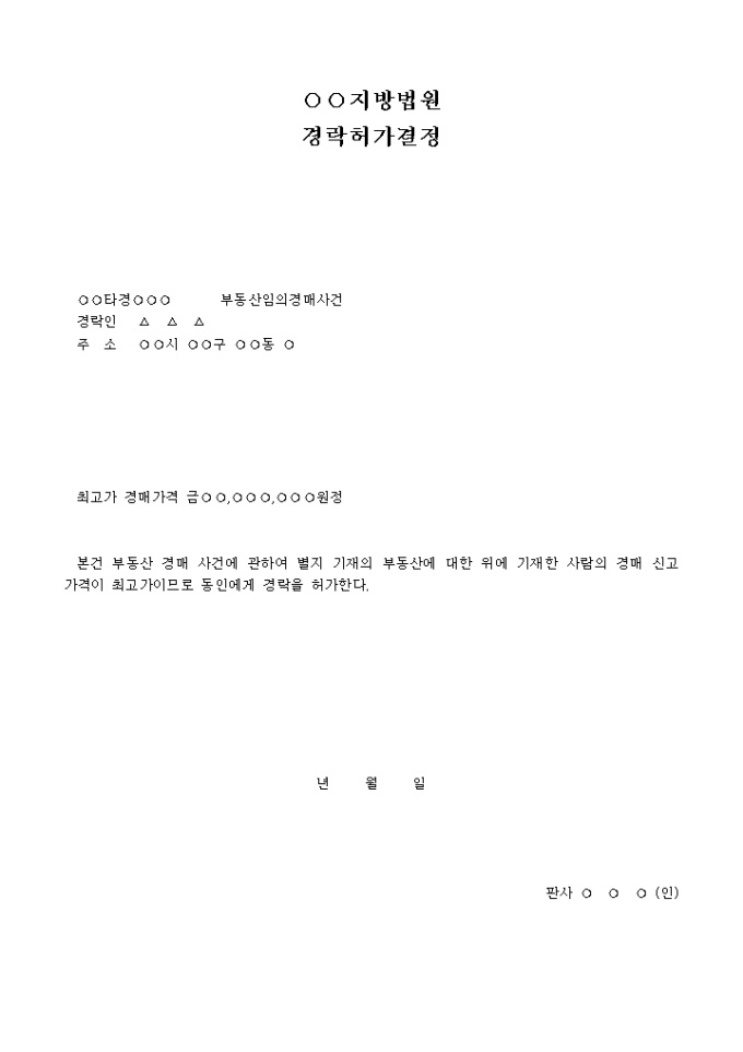 부동산임의경매사건에 대하여 부동산 경매 사건에 관하여 별지 기재의 부동산에 대한 위에 기재한 사람의 경매 신고 가격이 최고가이므로 동인에게 경락을 허가한다라는 내용의 결정서입니다.