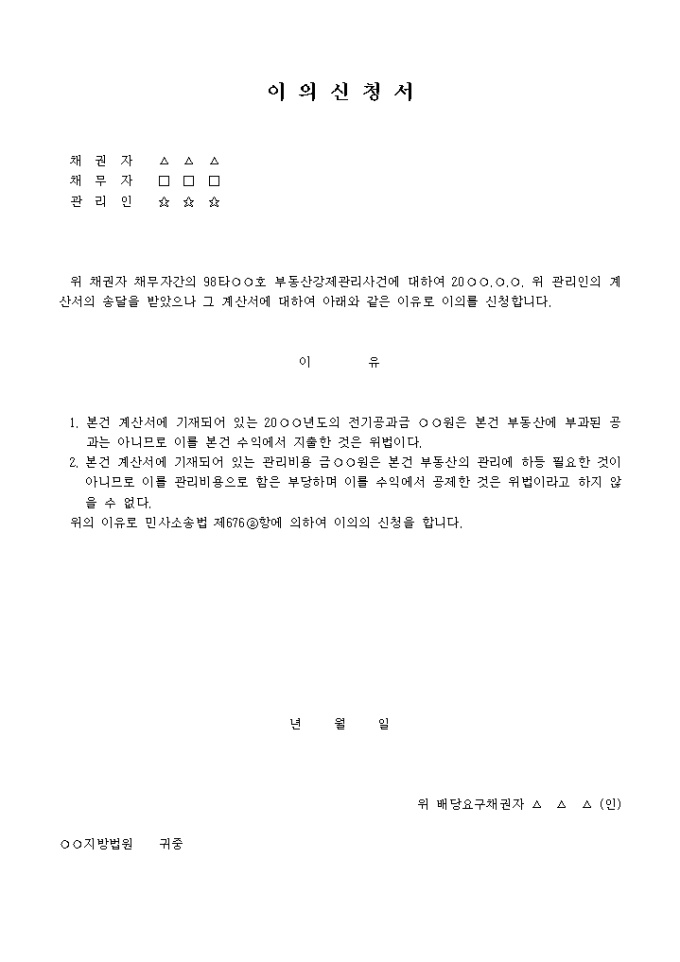 관리인의 계산에 대한 이의신청서