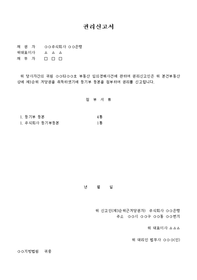부동산 임의경매사건에 관하여 권리신고인은 위 본건부동산상에 제3순위 저당권을 취득하였기에 등기부 등본을 첨부하여 권리를 신고한다는 내용입니다.