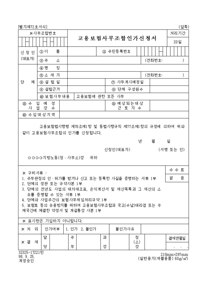 9,000원/월고용보험법시행령 제78조제1항 및 동법시행규칙 제77조제1항의 규정에 의하여 고용보험 사무조합의 인가를 신청하고자 할 때 사용하는 "고용보험 사무조합 인가신청서" 양식입니다.