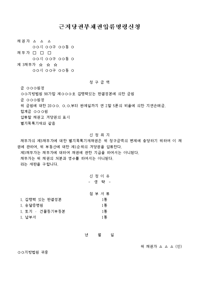 9,000원/월채무자의 제3채무자에 대한 별지목록기재채권은 위 청구금액의 변제에 충당하기 위하여 이 채권에 관하여 , 위 부동산에 대한 제1순위의 저당권을 압류한다라는 판결을 구하는 내용입니다.