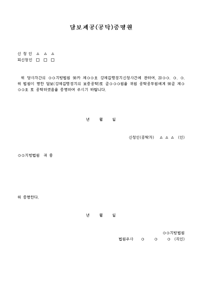 9,000원/월강제집행정지신청사건에 관하여 법원이 명한 담보(강제집행정지의 보증공탁)로 금..원을 귀원 공탁공무원에게 공탁하였음을 증명 요청하는 내용입니다.
