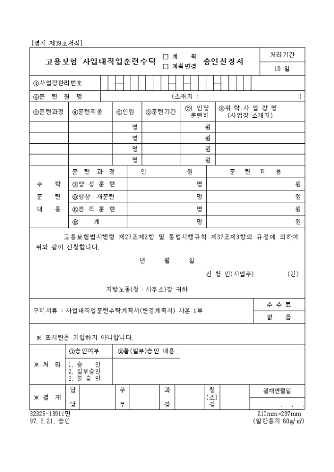 9,000원/월고용보험법시행령 제27조제2항 및 동법시행규칙 제37조제3항의 규정에 의하여 신청하고자 할 때 사용하는 "고용보험 사업내 직업훈련 수탁(계획,계획 변경)승인신청서" 양식입니다.