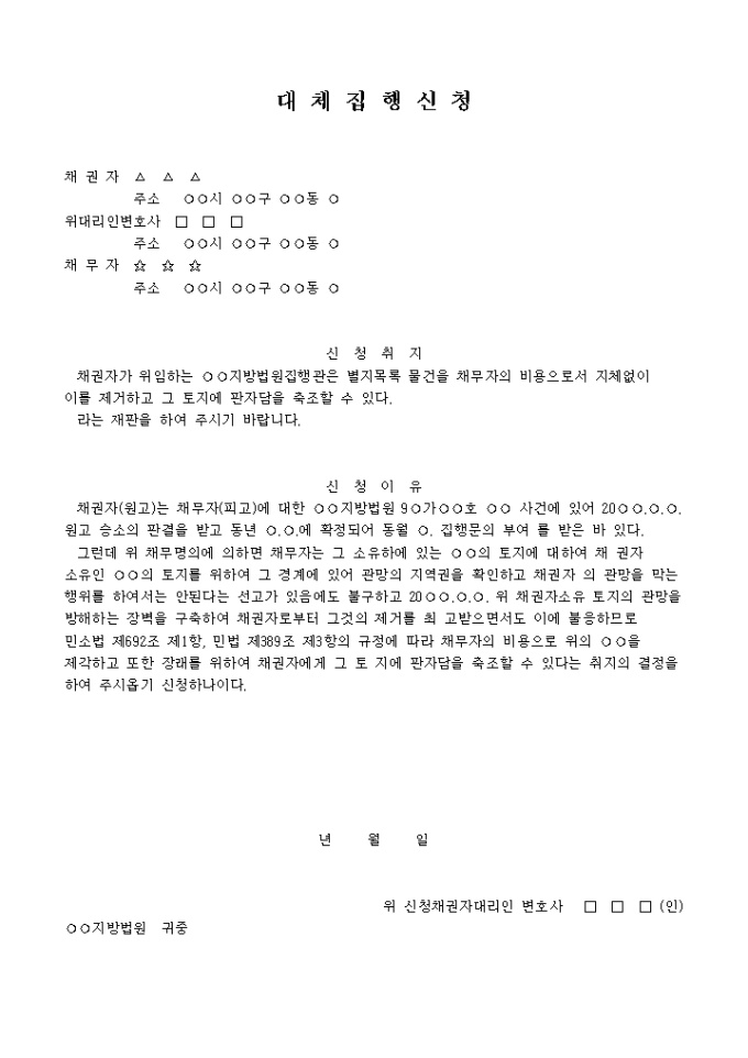 채권자가 위임하는 ..지방법원집행관은 별지목록 물건을 채무자의 비용으로서 지체없이 이를 제거하고 그 토지에 판자담을 축조할 수 있다라는 재판을 구하는 내용입니다.