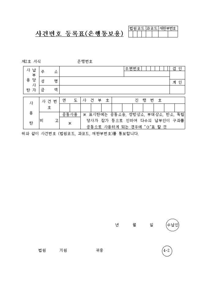 9,000원/월납부당사자의 주소, 성명, 금액과 사건번호를 기록하는 사건번호등록표입니다.