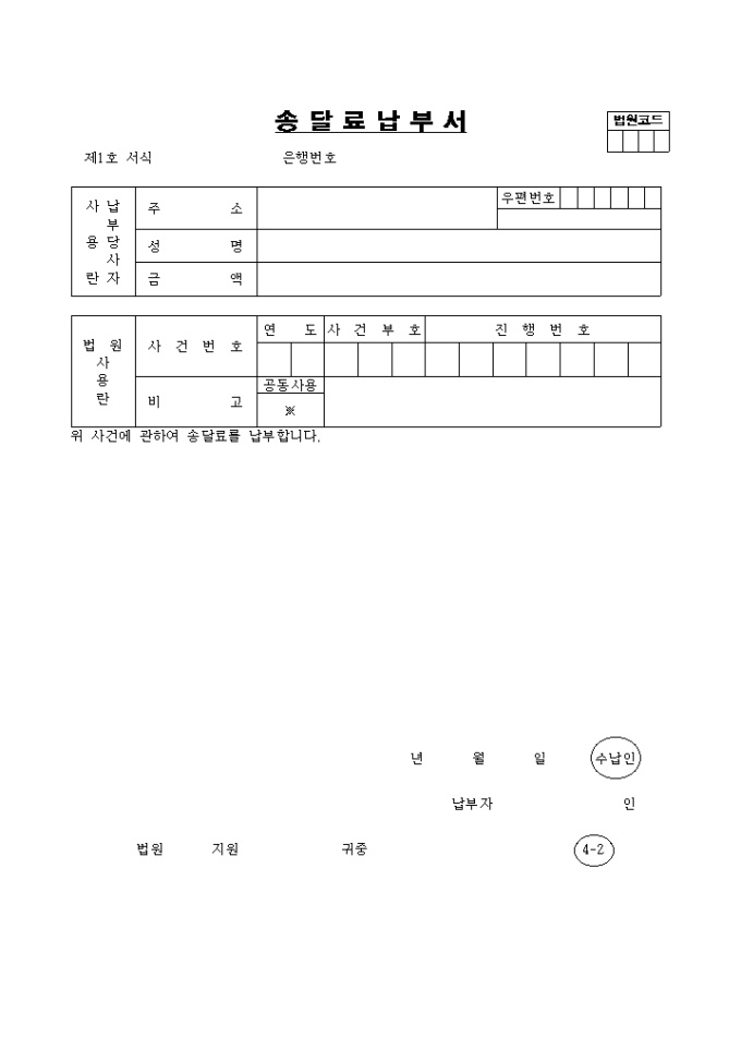 9,000원/월납부당사자 주소, 성명, 금액과 사건번호, 연도, 사건부호, 진행번호를 기재하는 양식입니다.