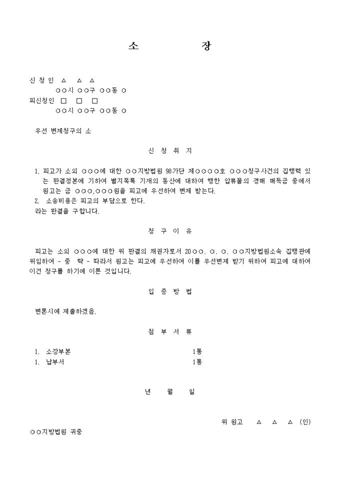 9,000원/월...청구사건의 집행력 있는 판결정본에 기하여 별지목록 기재의 동산에 대하여 행한 압류물의 경매 매득금 중에서 원고는 금...원을 피고에 우선하여 변제 받는다라는 판결을 구하는 내용입니다.