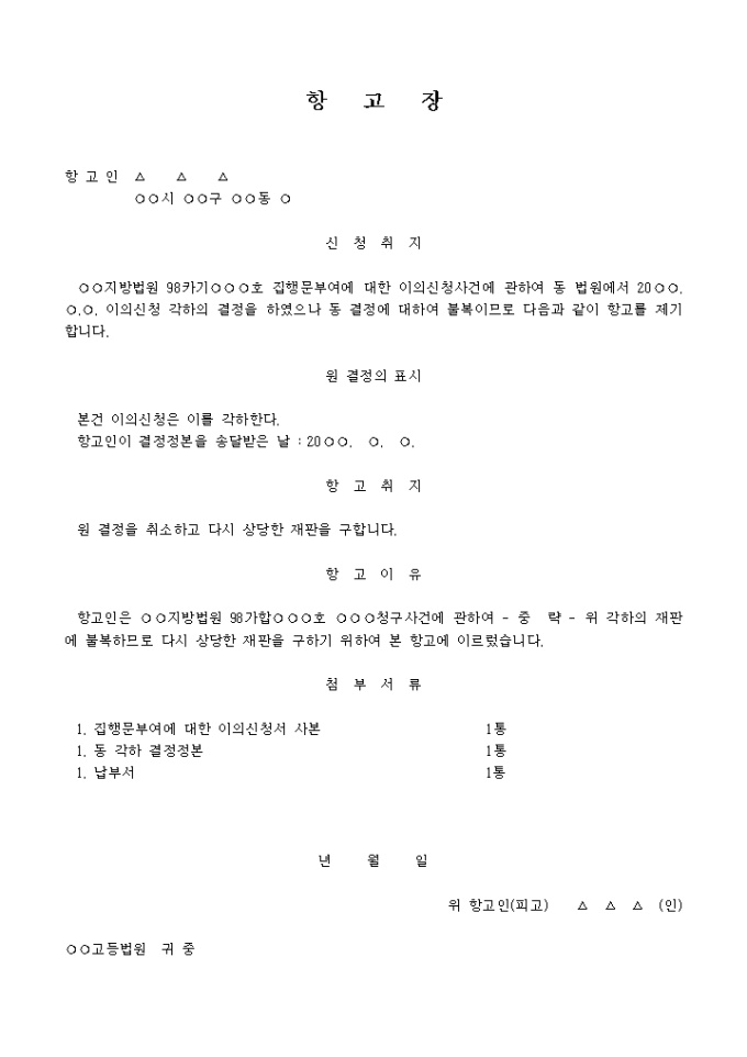 집행문부여에 대한 이의신청사건에 관하여 동 법원에서 20 . . . 이의신청 각하의 결정을 하였으나 동 결정에 대하여 불복함으로 항고를 제기하는 항고장입니다.