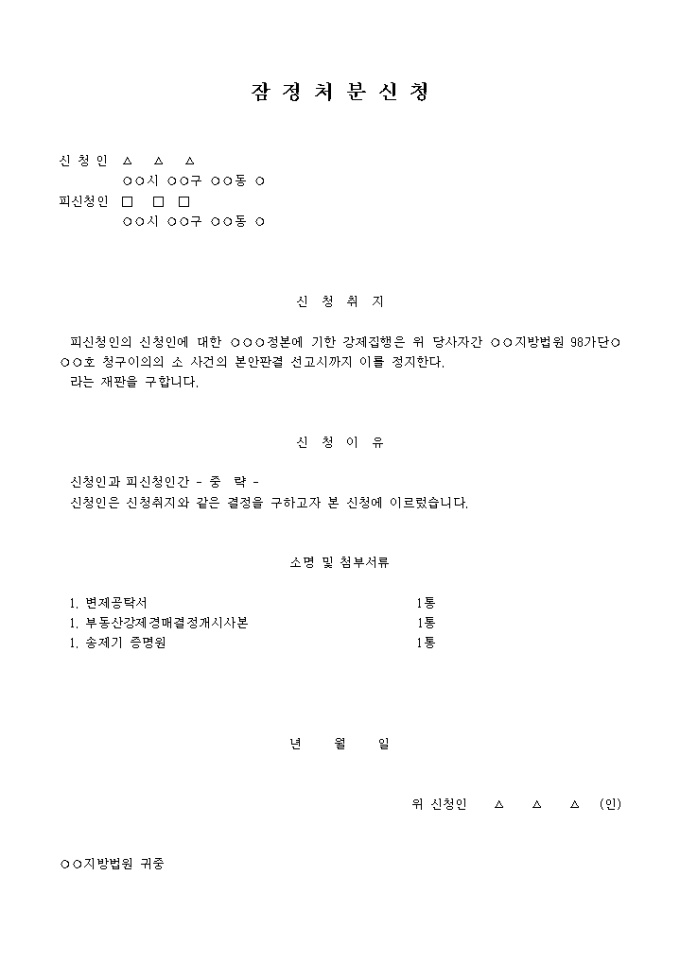 9,000원/월피신청인의 신청인에 대한 ○○○정본에 기한 강제집행은 청구이의의 소 사건의 본안판결 선고시까지 이를 정지한다라는 재판을 구하는 내용입니다.