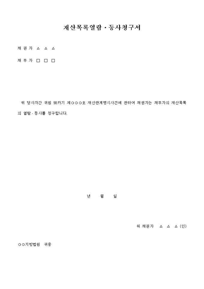 9,000원/월재산관계명시사건에 관하여 채권자는 채무자의 재산목록의 열람․등사를 청구하는 내용입니다