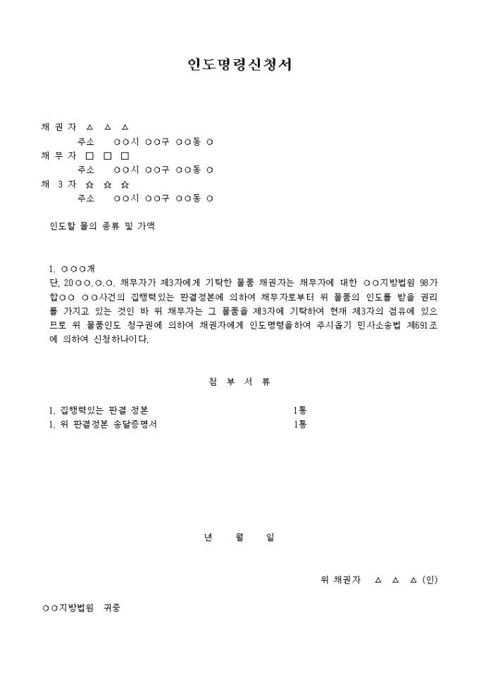 9,000원/월...사건의 집행력있는 판결정본에 의하여 채무자로부터 위 물품의 인도를 받을 권리를 가지고 있는 것인 바 위 채무자는 그 물품을 제3자에 기탁하여 현재 제3자의 점유에 있으므로 위 물품인도 청구권에 의하여 채권자에게 인도 명령을 요청하는 내용입니다.