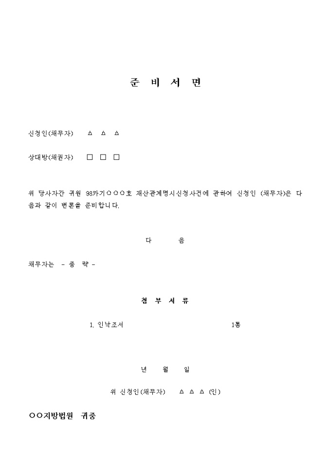 재산관계명시신청사건에 관하여 신청인 (채무자)의 변론을 준비하라는 내용입니다.