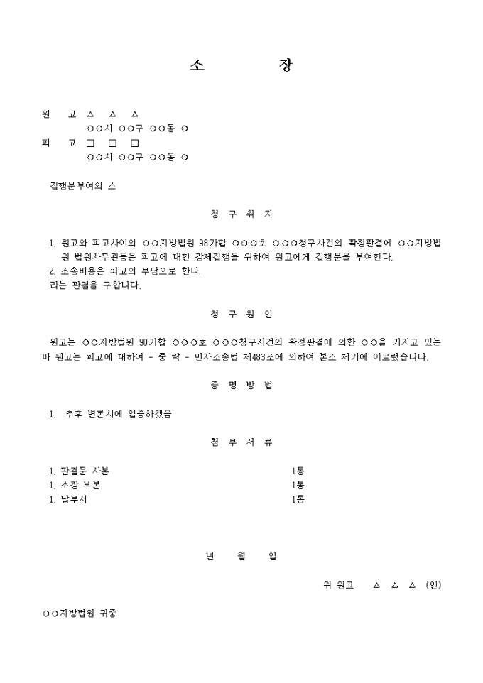 피고에 대한 강제집행을 위하여 원고에게 집행문을 부여한다라는 판결을 구하는 내용입니다.