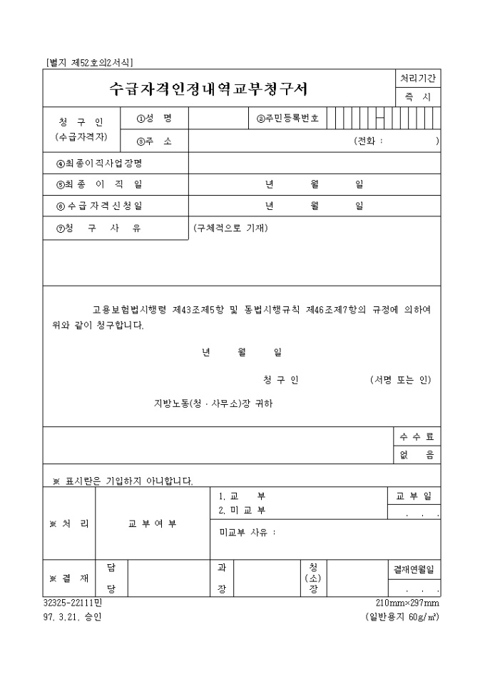 9,000원/월고용보험 수급자격 인정내역 교부청구서 양식입니다.