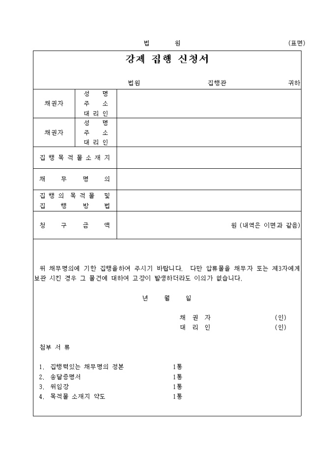 채권자의 성명, 주소, 대리인과 집행목적물소지재, 채무명의, 집행의 목적물 치 집행방법, 청구금액을 기록하는 강제 집행신청서입니다.