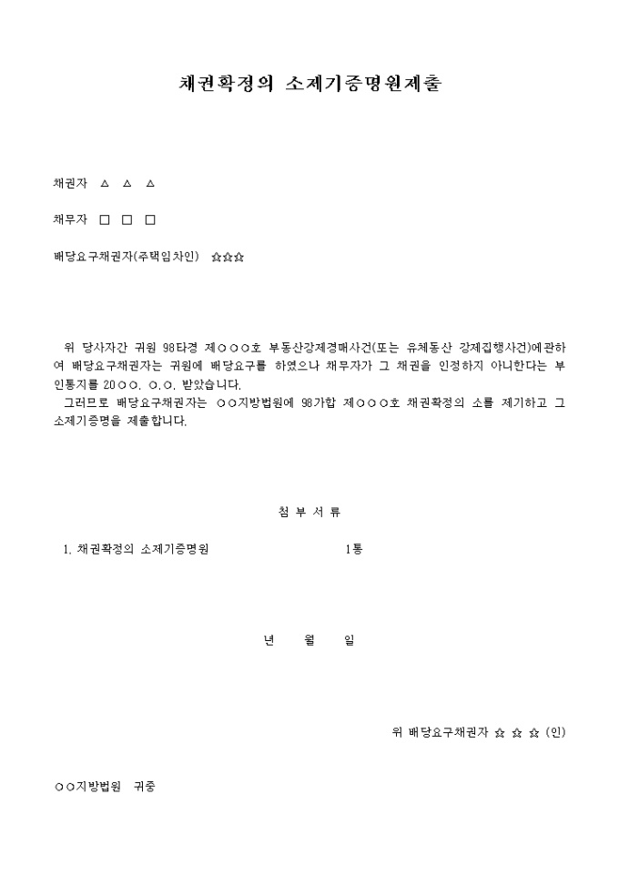부동산강제경매사건(또는 유체동산 강제집행사건)에관하여 배당요구채권자는 귀원에 배당요구를 하였으나 채무자가 그 채권을 인정하지 아니한다는 부인통지를 받아 배당요구채권자는 채권확정의 소를 제기하고 그 소제기증명을 제출한다는 내용입니다.