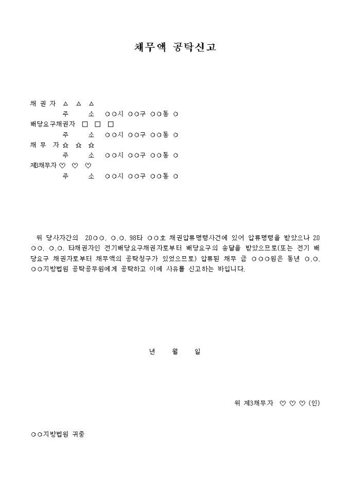 9,000원/월채권압류명령사건에 있어 압류명령을 받았으나 타채권자인 전기배당요구채권자로부터 배당요구의 송달을 받았으므로 압류된 채무 금 ○○○원은 ○○지방법원 공탁공무원에게 공탁하고 이에 사유를 신고한다는 내용입니다.