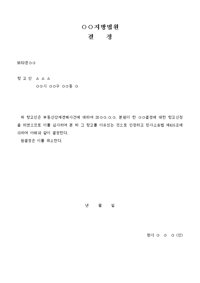 9,000원/월부동산강제경매사건에 대하여 항고신청을 이유있는 것으로 인정하고 원결정은 이를 취소한다라는 내용의 결정서입니다.