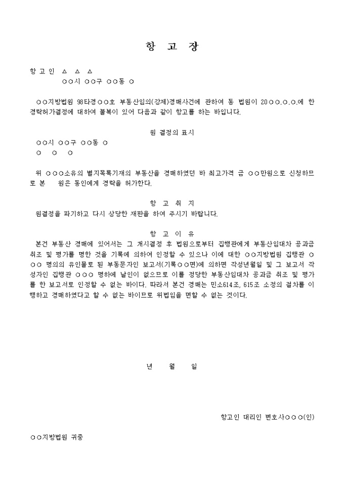 9,000원/월부동산임의(강제)경매사건에 관하여 경락허가결정에 대하여 불복이 있어 항고하는 내용입니다.