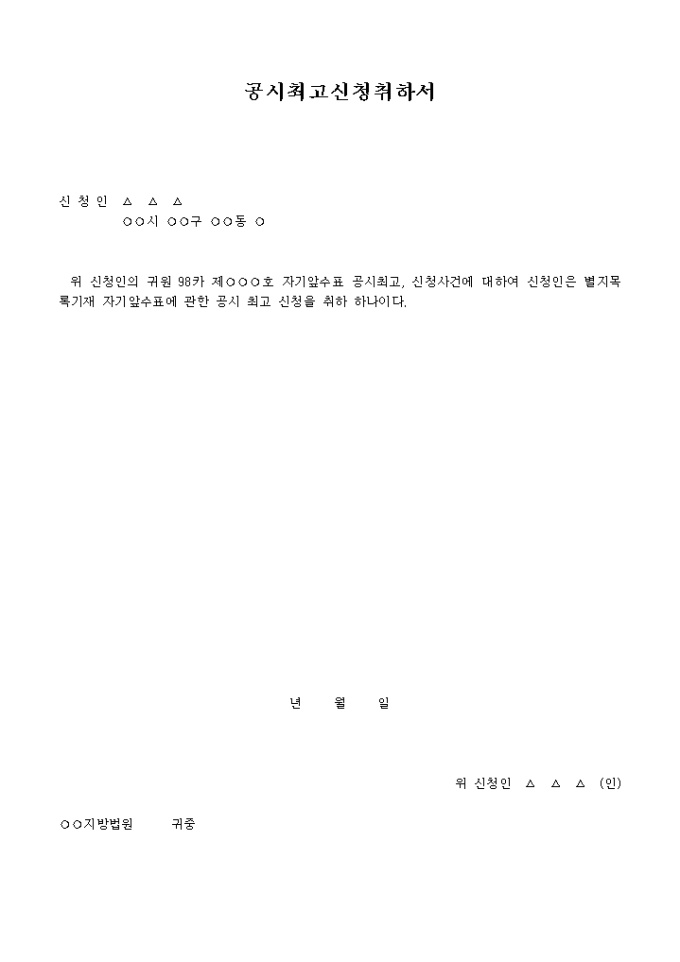 9,000원/월자기앞수표 공시최고, 신청사건에 대하여 신청인은 별지목록기재 자기앞수표에 관한 공시 최고 신청을 취하하는 내용입니다.