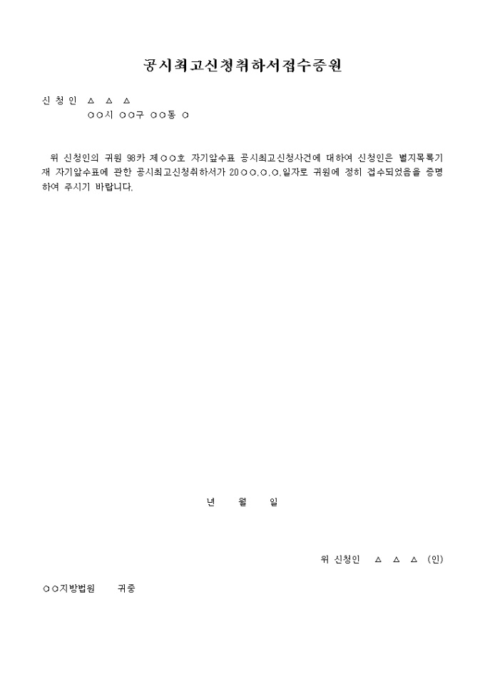 자기앞수표 공시최고신청사건에 대하여 공시최고신청취하서가 접수되었음을 증명하는 양식입니다.