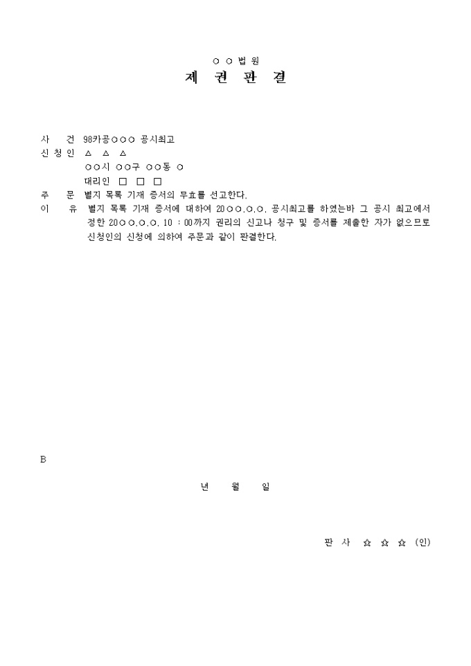 공시 최고의 권리의 신고나 청구 및 증서를 제출한 자가 없으므로 신청인의 신청에 의하여 주문과 같이 증서의 무효를 선고한다는 내용의 판결서입니다.