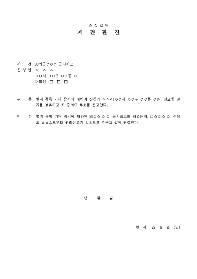 9,000원/월공시최고에 관한 사건에 대해 별지 목록 기재 증서에 대하여 신고한 권리를 보유하고 위 증서의 무효를 선고한다는 내용의 판결서입니다.