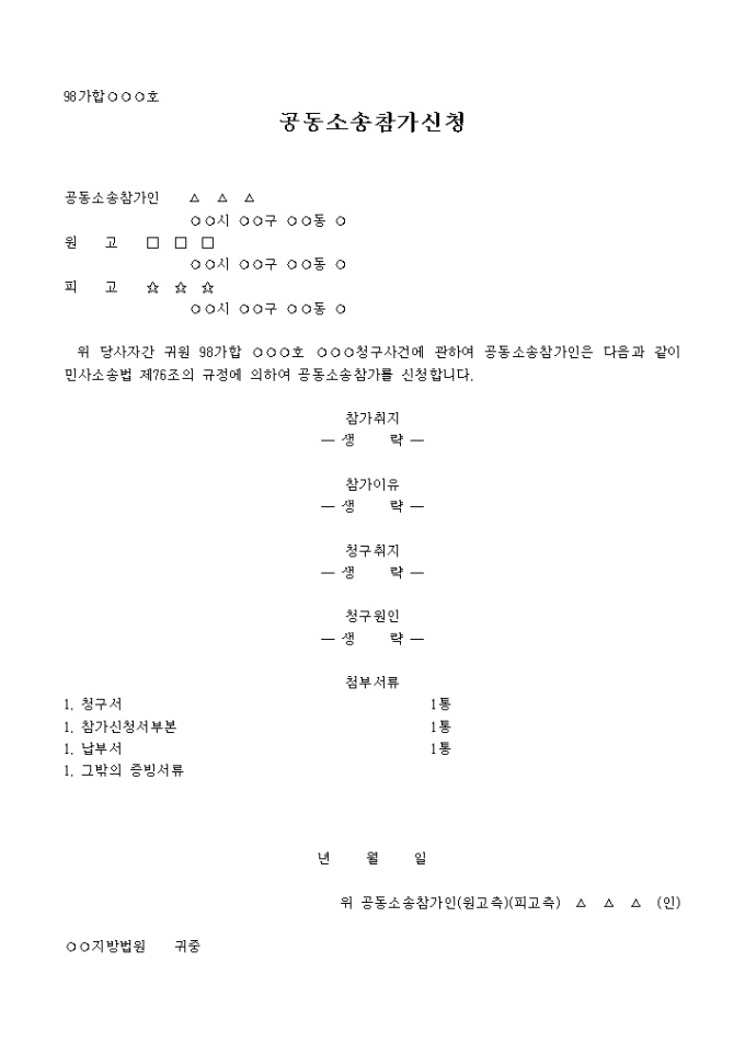 9,000원/월○○○청구사건에 관하여 공동소송참가이 참가취지, 참가이유, 청구취지, 청구원인을 기록하는 양식입니다.