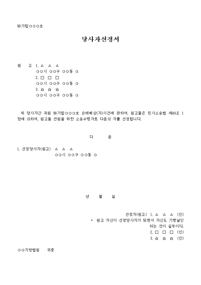 손해배상(자)사건에 관하여, 원고들은 민사소송법 제49조 1항에 의하여, 원고들 전원을 위한 소송수행자로 선정당사자를 기록하는 양식입니다.