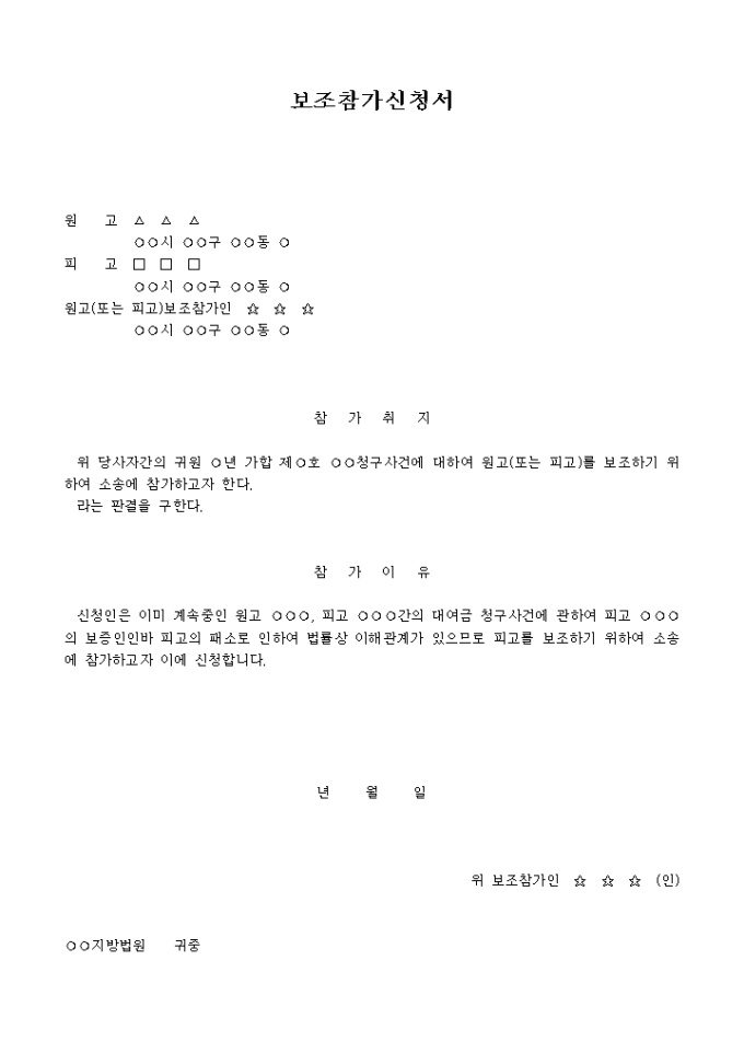 ○○청구사건에 대하여 원고(또는 피고)를 보조하기 위하여 소송에 참가하고자 한다라는 판결을 구한다는 내용입니다.
