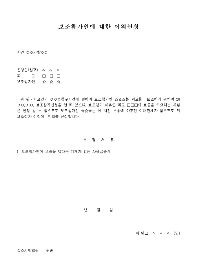 9,000원/월○○○청구사건에 관하여 피고는 보조참가신청을 한 바 있으나 이 사건 소송에 아무런 이해관계가 없으므로 위 보조참가 신청에 이의를 신청한다는 내용입니다.