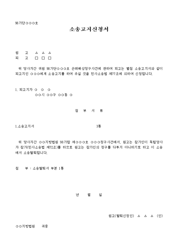 9,000원/월손해배상청구사건에 관하여 피고는 별첨 소송고지서와 같이 피고지인에게 소송고지를 하여 주실 것을 민사소송법 제77조에 의하여 신청하는 내용입니다.