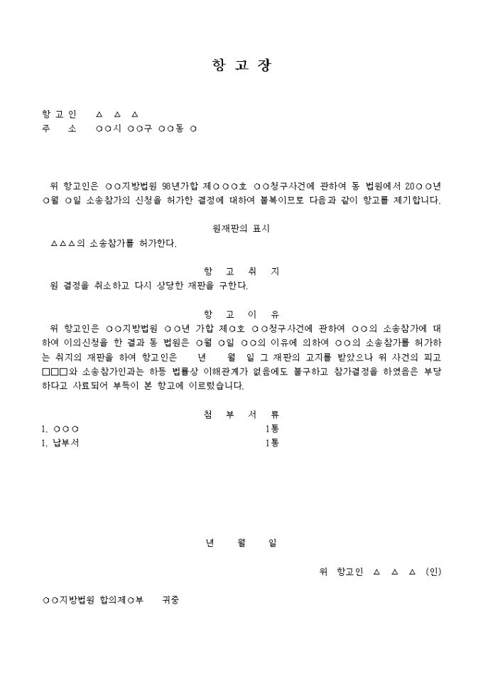 ○○청구사건에 관하여 동 법원에서 20○○년 ○월 ○일 소송참가의 신청을 허가한 결정에 대하여 불복함으로 항고장을 제출한다는 내용입니다.