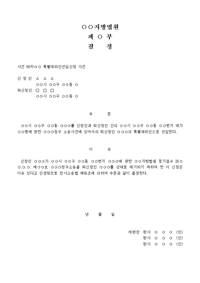 9,000원/월○○○청구 소송사건에 있어서의 피신청인 ○○○의 특별대리인으로 선임한다는 내용의 결정서입니다.