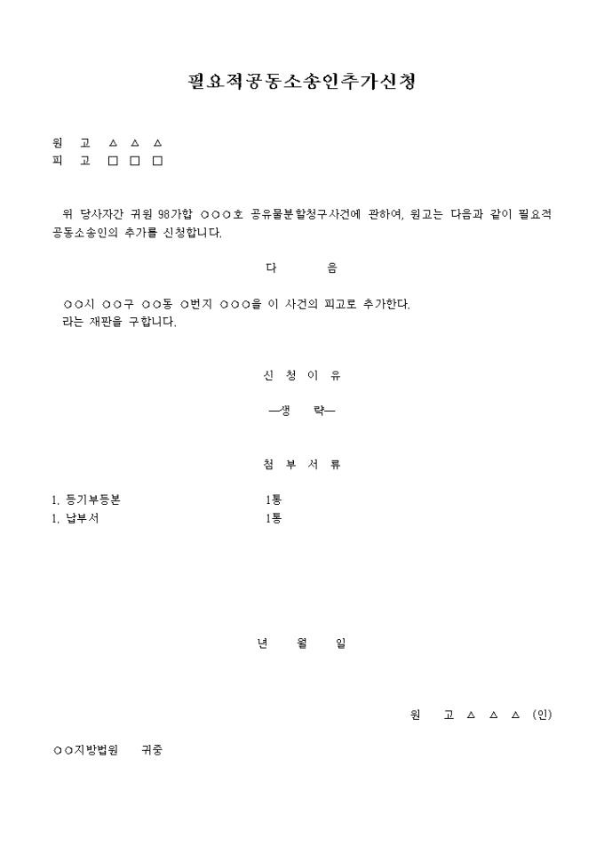 9,000원/월공유물분할청구사건에 관하여 , 원고는 ...과 같이 필요적공동소송인의 추가를 신청한다는 내용입니다.