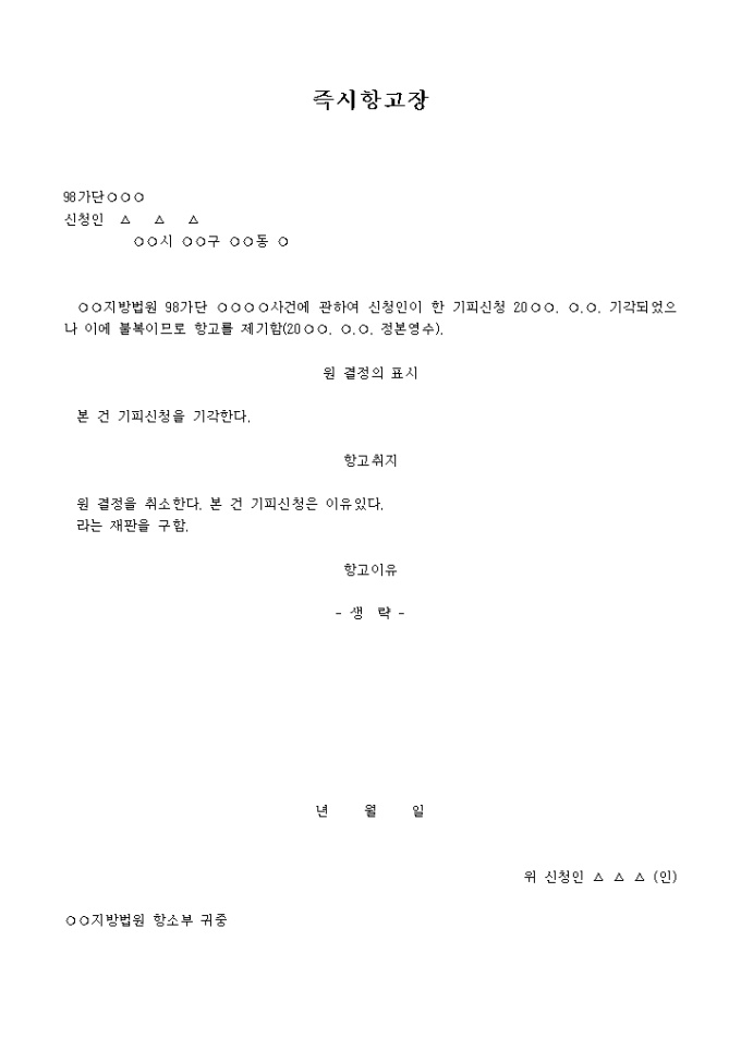법관기피신청기각결정에 대한 즉시항고장