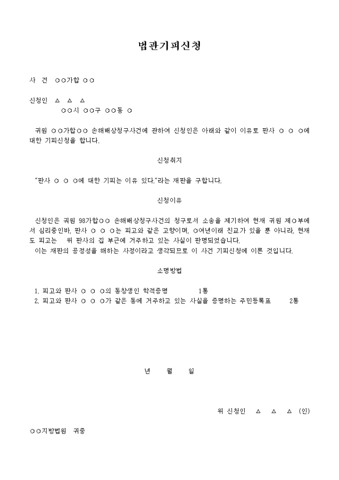 9,000원/월손해배상청구사건에 관하여 신청인은 ...와 같이 이유로 판사 ○ ○ ○에 대한 기피신청을 한다는 내용입니다.